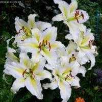 Лилия Кокосса, относящаяся к ОТ-гибридам, станет достойным украшением вашего летнего сада. Эта шикарная голландская красавица отлично освоилась в наших широтах, подарив садоводам возможность любоваться своей красотой ежедневно с июля до конца августа. Соцветия Кокосса невероятно огромные и эффектные! По центре их молочно-белых лепестков, изящно отогнутых к стеблю, проходит лимонно-желтая, а местами даже оливковая полоса. Необычной составляющей бутонов по праву можно назвать и оранжево-коричневые пыльники, которые внешне так напоминают остренькие коготки кошки. Но не волнуйтесь! Лилия Кокосса не причинит вам никакого вреда!