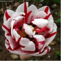 Тюльпан Карнавал в Ницце относится к махровым поздним сортам. Многолетние травянистые растения до 50 см высоты. Листья крупные, широкие, прямостоячие, сизо-зеленые, с четкой белой каймой. Цветки до 12 см диаметром, густомахровые, округло-чашевидные, плотные, пестро окрашенные, белые с красным перистым узором.
